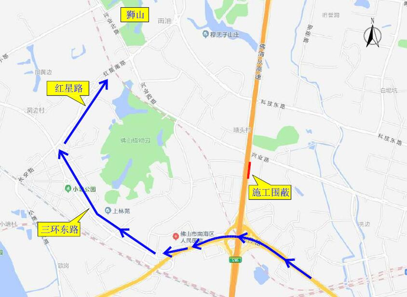 施工期间,需要途经桂丹立交桥至佛山一环辅道往兴业路、狮山小塘方向的过往车辆,请提前规划出行路线,注意现场交通指引,留意交通状况。