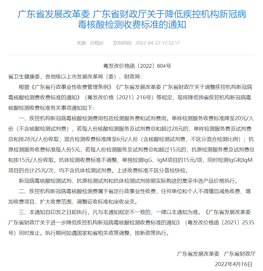 4月22日,广东省发展改革委、广东省财政厅发布了《关于降低疾控机构新冠病毒核酸检测收费标准的通知》(下称《通知》)。