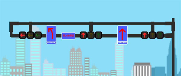 在信号灯绿灯的最后几秒中,待行区显示屏会提前转为红灯,即待行区功能关闭,此时车辆按照常规的路口通行方式,根据信号灯指引通过路口。