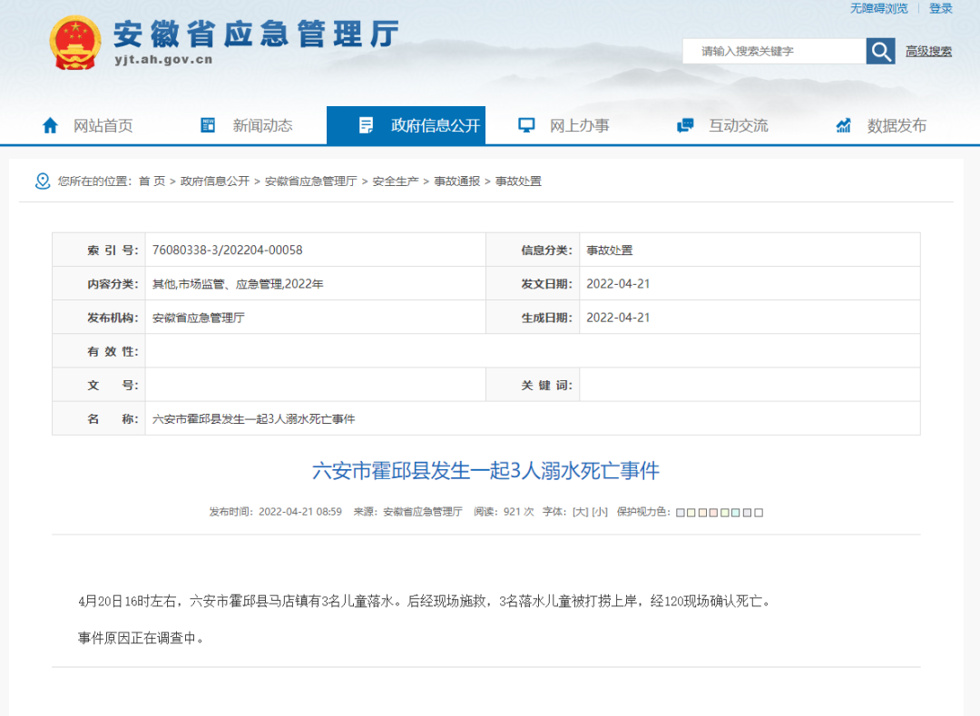 4月20日16时左右,安徽省六安市霍邱县马店镇有3名儿童落水。后经现场施救,3名落水儿童被打捞上岸,经120现场确认死亡。事件原因正在调查中。