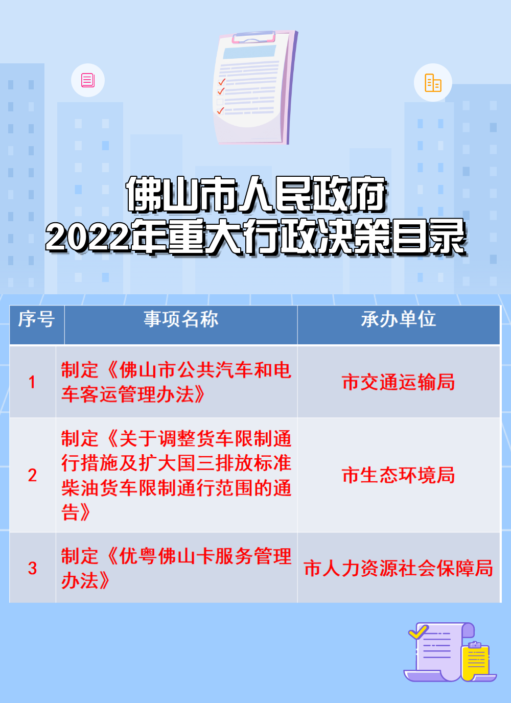 4月24日,经市人民政府同意,由市司法局收集、审查、编制的《佛山市人民政府2022年重大行政决策目录》正式公布。佛山市严格履行重大行政决策事项目录编制程序要求,最终确定以下3个项目为本年度市政府重大行政决策事项,实行目录化管理。