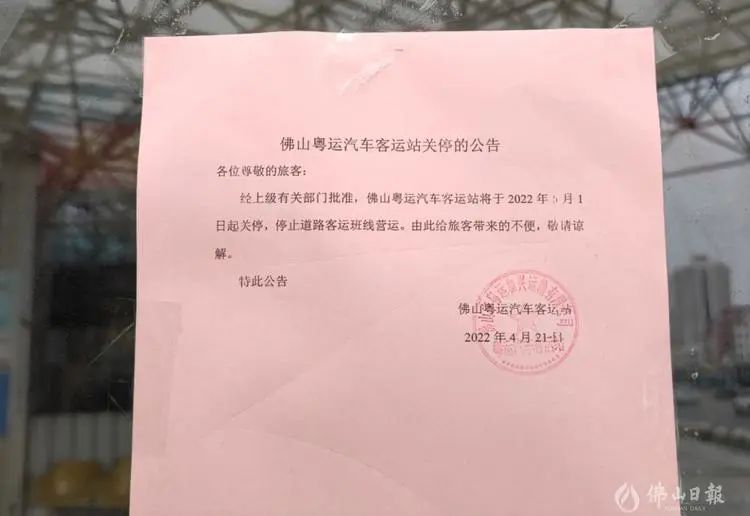 近日,佛山粤运汽车客运站(以下简称“粤运汽车站”)发布公告称,经上级有关部门批准,佛山粤运汽车客运站将于2022年5月1日起关停,停止道路客运班线营运。