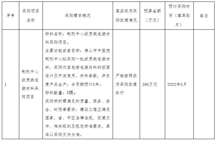 佛山市中医院2022年4月至5月政府采购意向公开情况