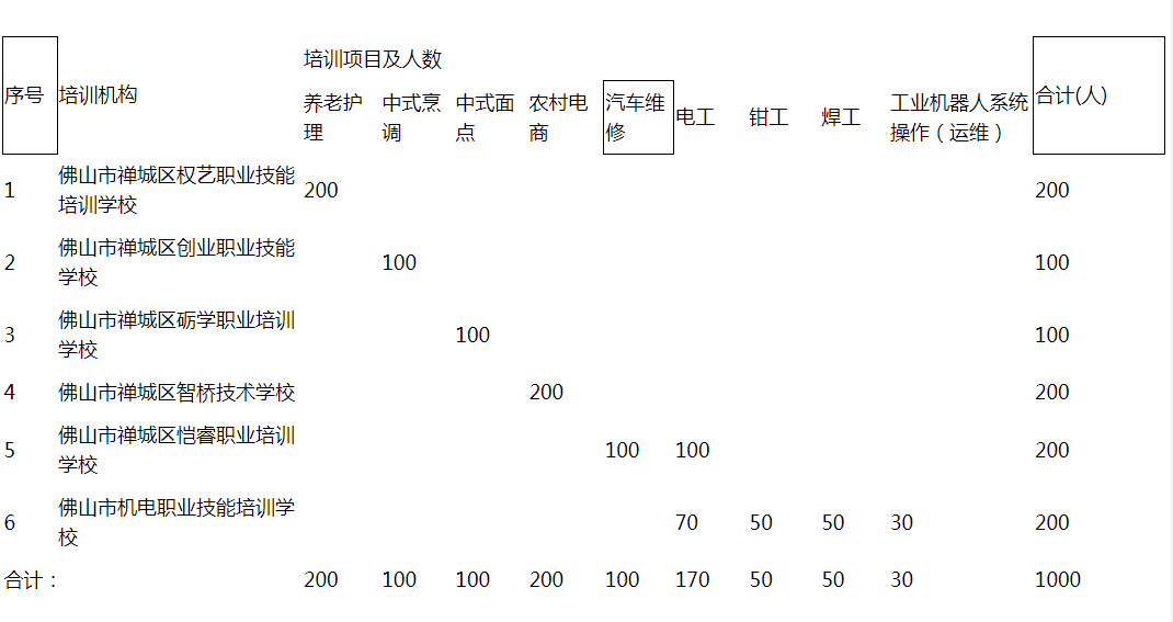 为满足禅城区高质量发展对技能人才的需求,打造一支技艺精湛、数量充足、梯队储备的技能人才队伍,根据《佛山市禅城区加强技能人才队伍建设实施办法(修订)》(佛禅府〔2020〕27号)精神,高质量推进“粤菜师傅”“广东技工”“南粤家政”三项工程,助力乡村振兴工作。按照《佛山市禅城区人力资源和社会保障局关于开展2022年禅城区紧缺工种委托培训项目申报的通知》文件要求,经在2022年3月18日在局网站公示,共有11家机构申报。经禅城区人社局进行综合评议,现将结果公示如下: