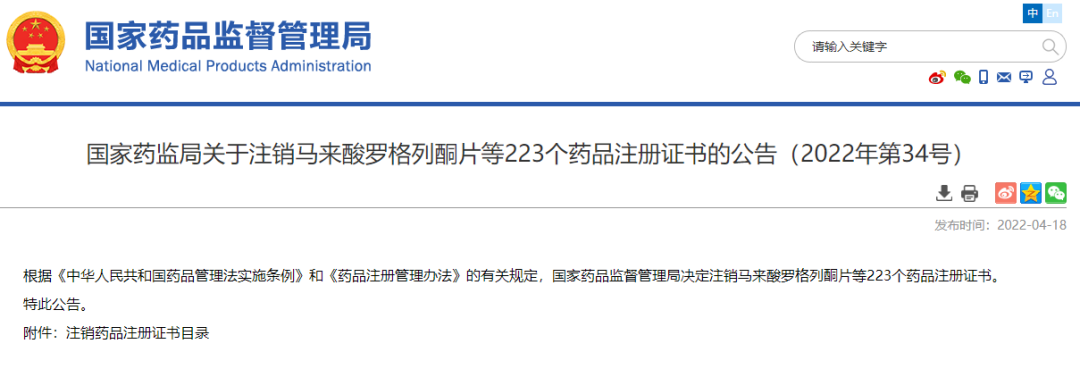 注销马来酸罗格列酮片