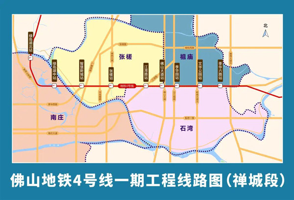 佛山地铁4号线一期(禅城段)经绿岛湖片区后沿季华路横穿主城区进入桂城,线路全长约15.6公里,沿途共设立9个站点,其中智慧新城站、张槎站、季华六路站已与地铁2号线、地铁3号线同步建设,绿岛湖北站、绿岛湖中站拟于近期陆续实施道路围蔽施工。