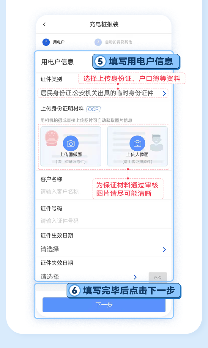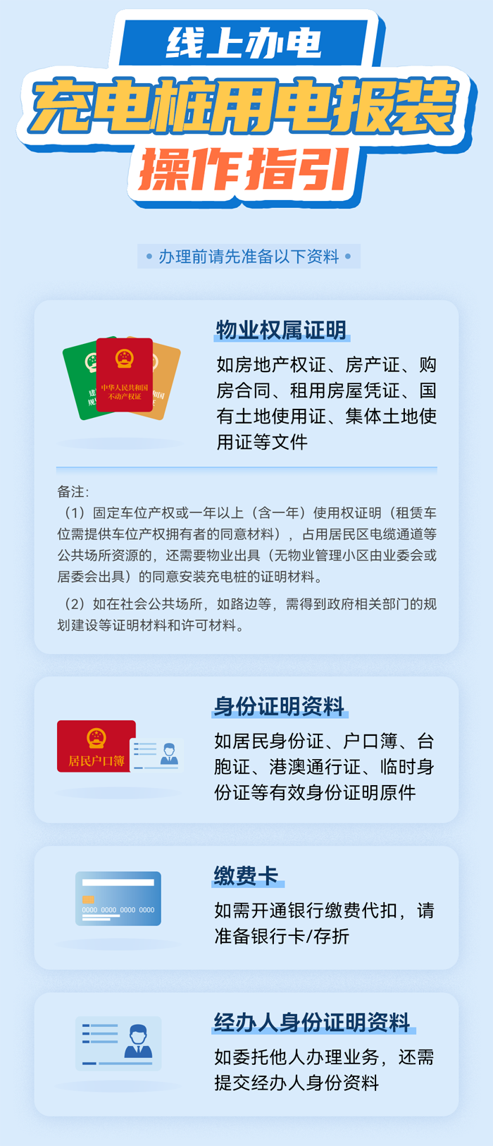●充电设施个人自用:需提交居民身份证、军人证(现役)、护照、驾驶证、户口本、回乡证(台胞证)、外国护照、外国永久居留证(绿卡)、其它有效身份证明文书等材料复印件(其中之一)。