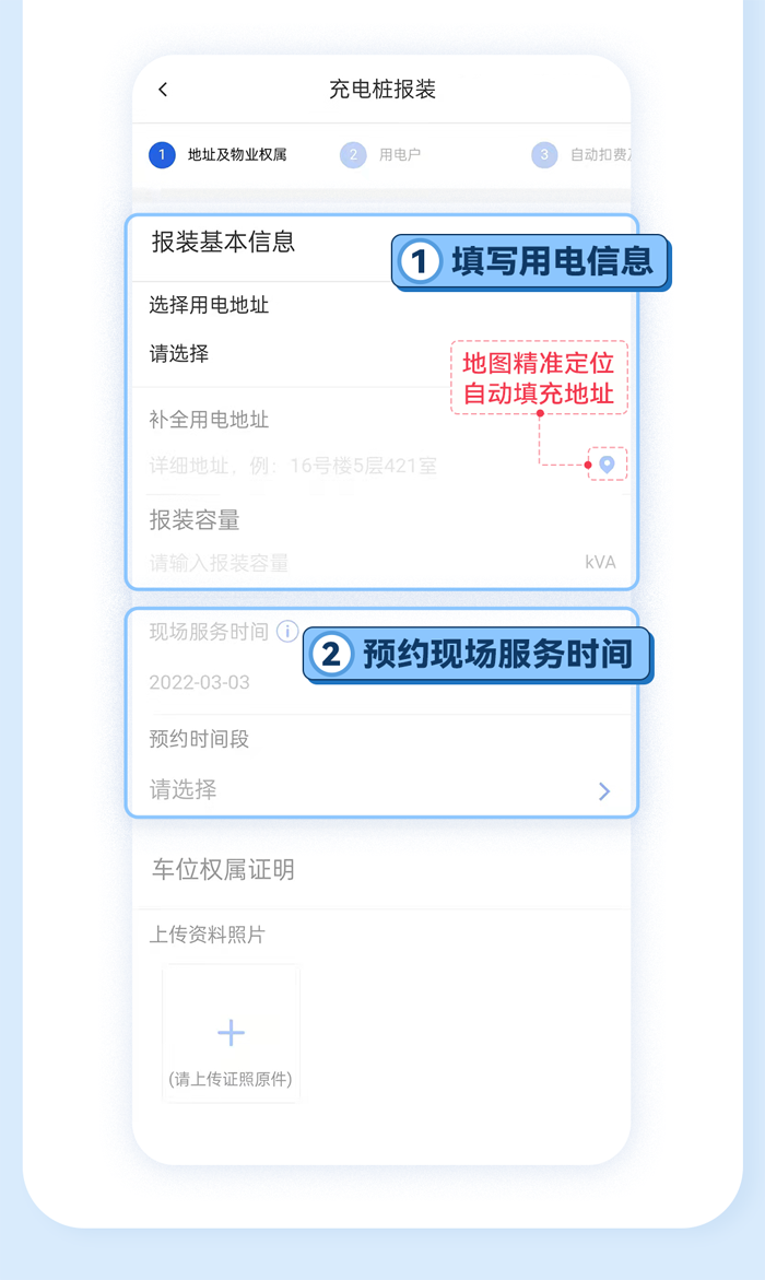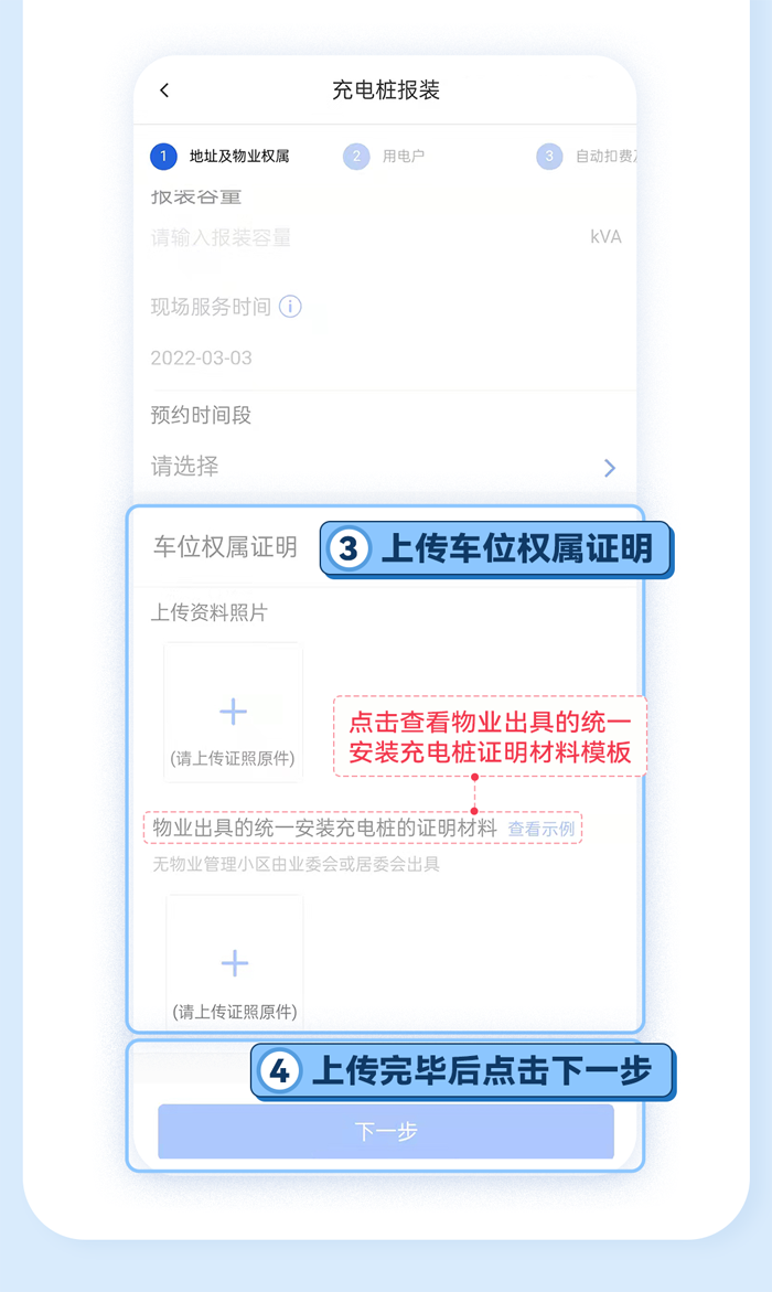 ●固定车位、自建停车库:需提交固定车位(车库)的产权证明,包括房产证、不动产证、人防车位使用证明、车位购置发票或经房管部门备案的《购房合同》等材料(其中之一),住宅小区统建车位还需提交物业公司出具的《安装充电设施同意书》,无物业公司管理的小区由业主委员会或当地居委会出具。如用电人并非停车位物权所有人,则除提交停车位物业权属证明材料外,还需提供物权所有人同意建设充电设施的证明文件。对于车位在房屋内的,则提供房屋的物业权属证明材料。