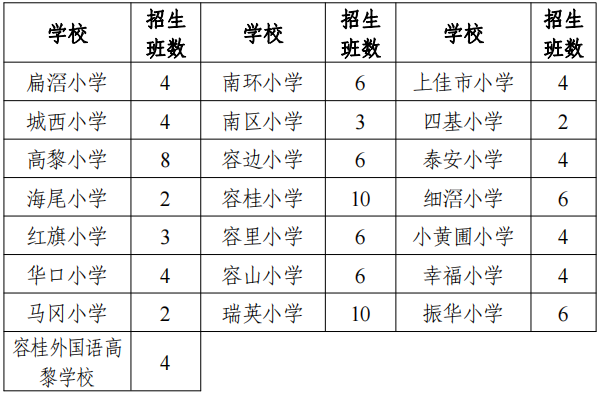2022年容桂街道公办小学一年级计划招收108个教学班,各校的招生班数如下: