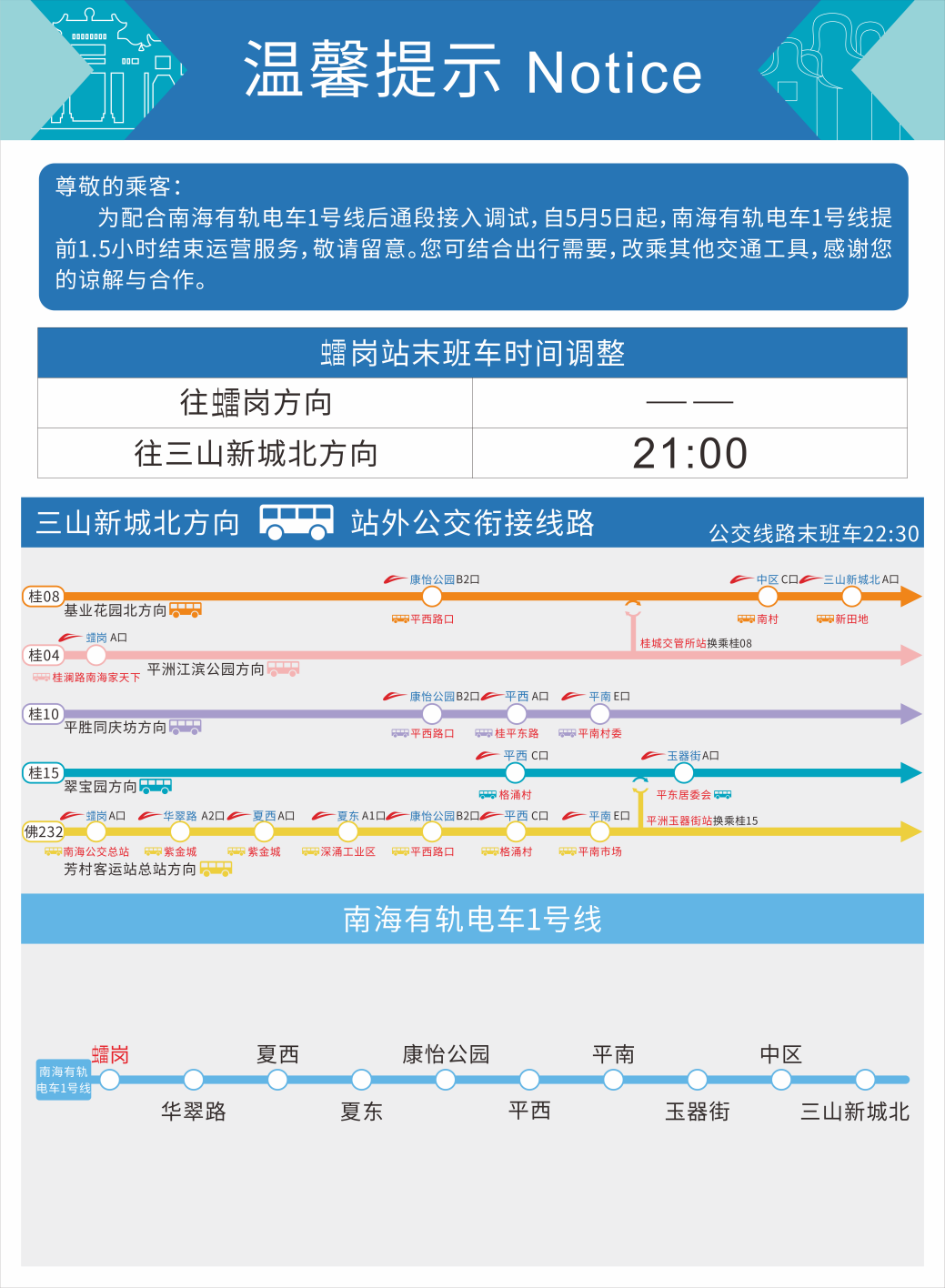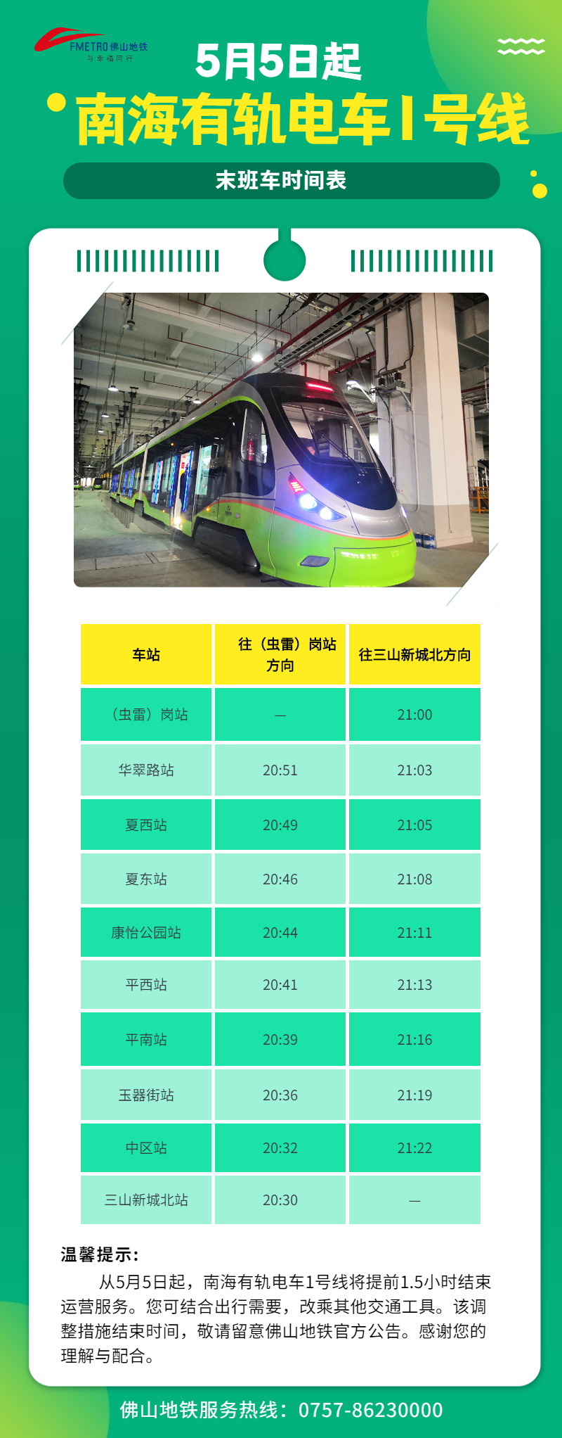 为配合南海有轨电车1号线后通段接入调试,自5月5日起,南海有轨电车1号线首通段【?岗站至三山新城北站】提前1.5小时结束运营服务,调整后,三山新城北站末班车时间为20:30、?岗站末班车时间为21:00。