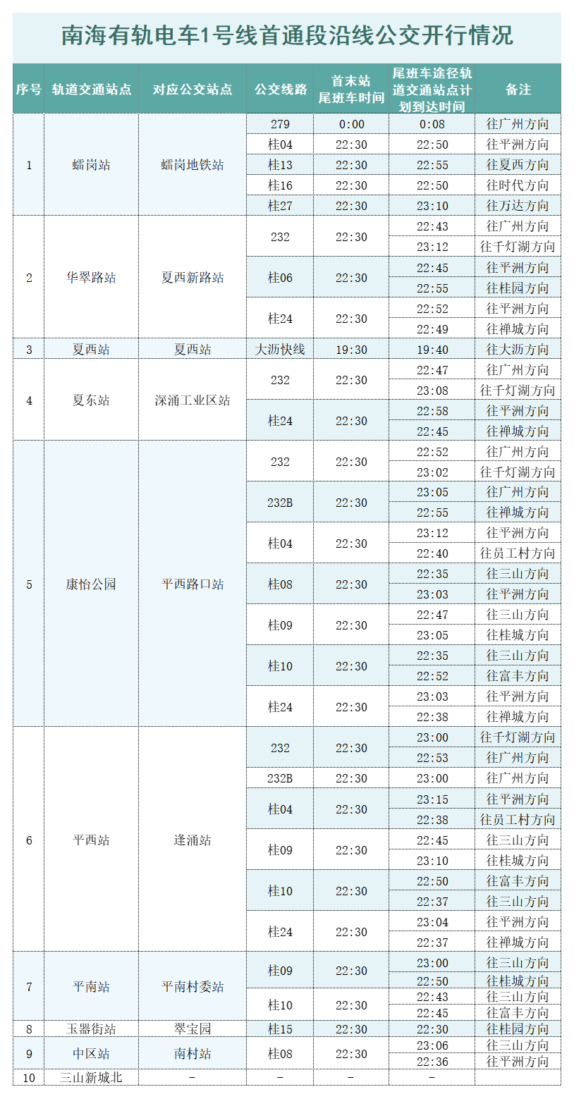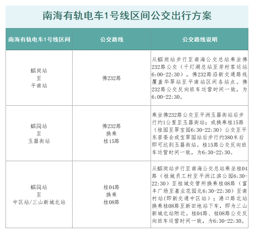 小编也整理了南海有轨电车1号线沿线公交开行情况以及区间公交出行方案,记得一键收藏!