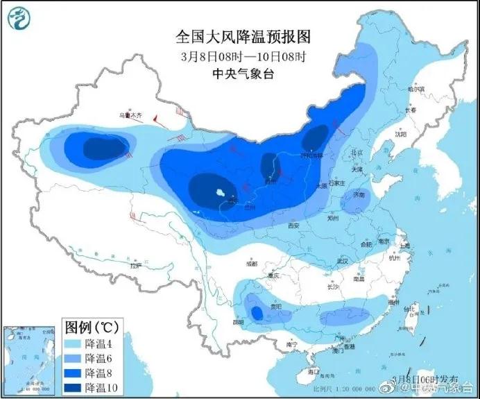 这股冷空气带来的降温广泛,我国北部地区已陆续受到波及。由于南方降温要比北方滞后些,今天开始才有所感,大部地区平均气温下降4~6℃。