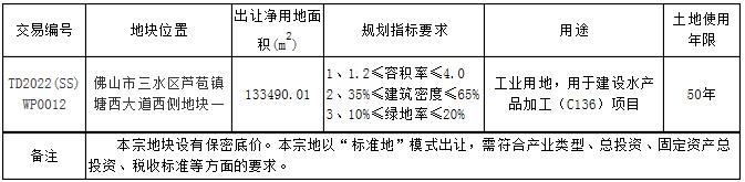 五、有意参与竞买者可于2022年4月29日后登录网上交易系统下载TD2022(SS)WP0012地块的《佛山市三水区国有建设用地使用权网上拍卖出让文件》。