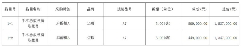 合同包1(麻醉科麻醉机): 2.065612万元。收取对象:中标(成交)供应商。