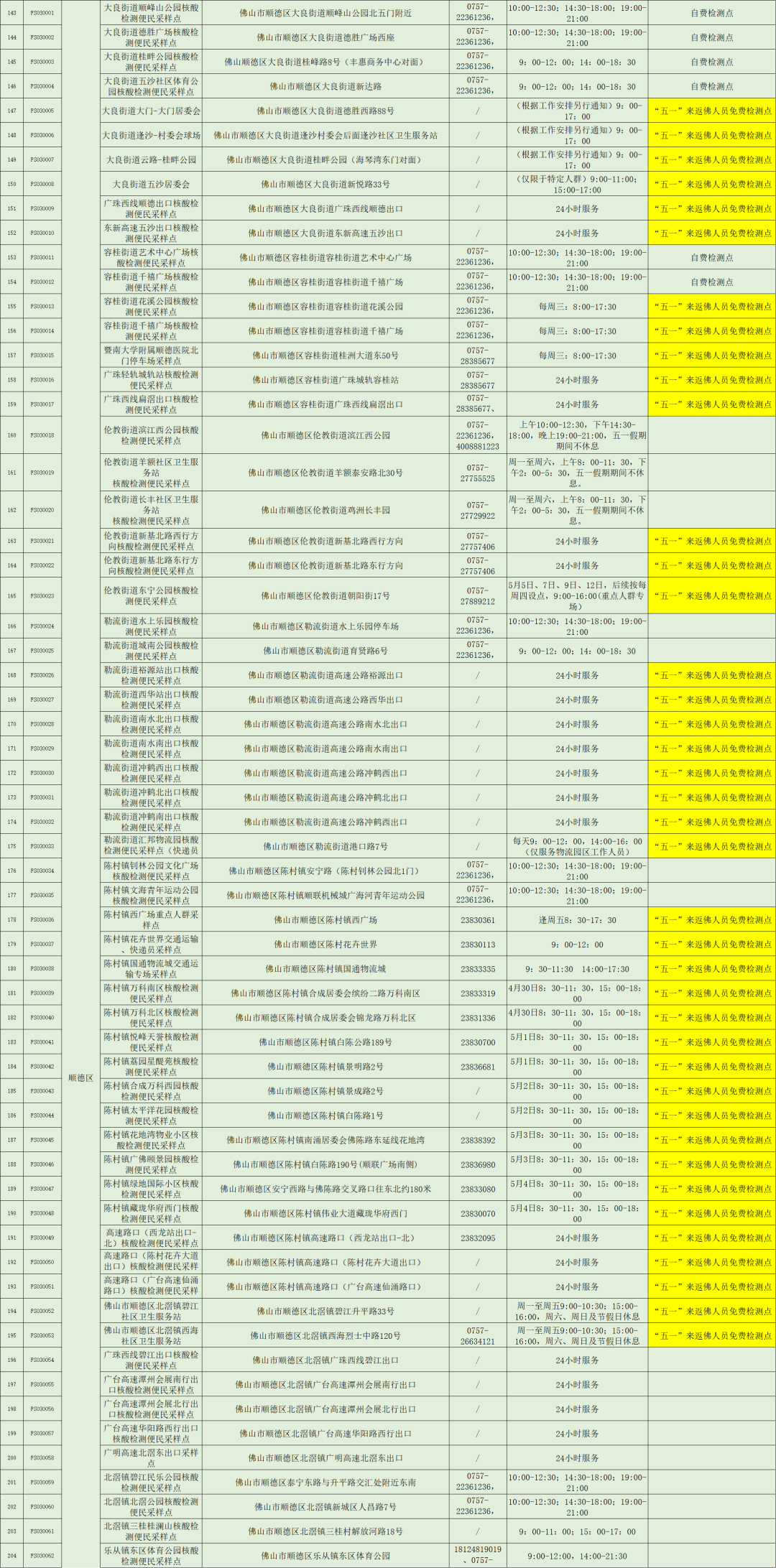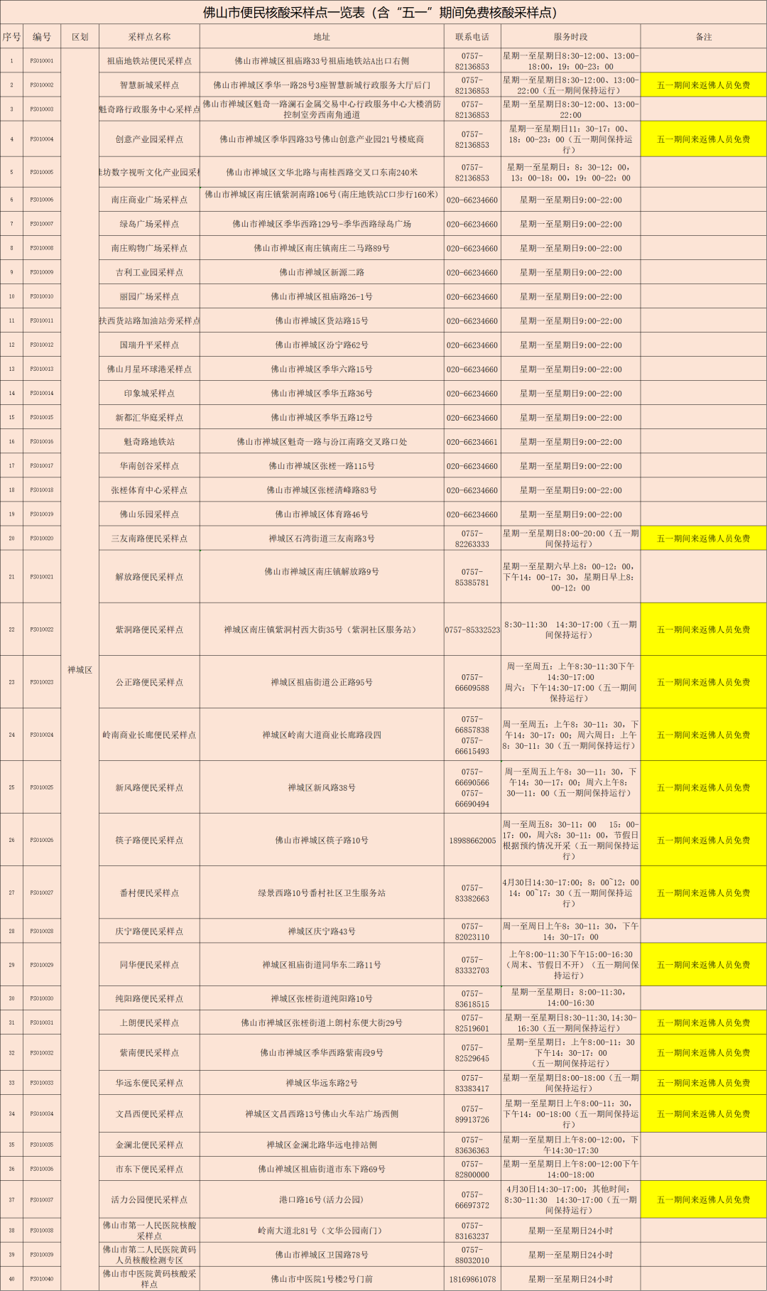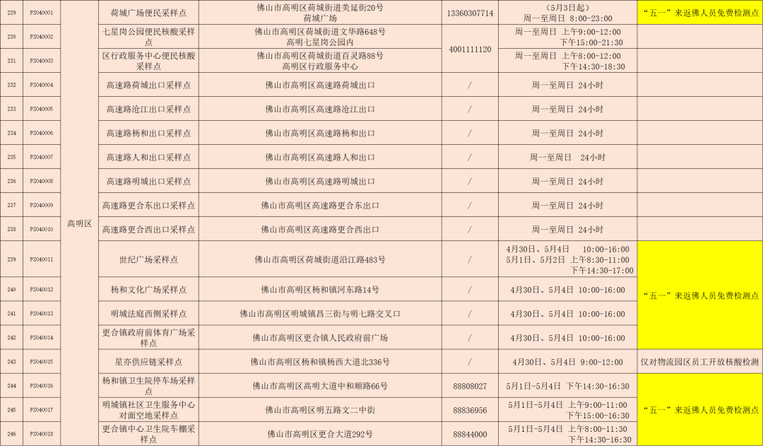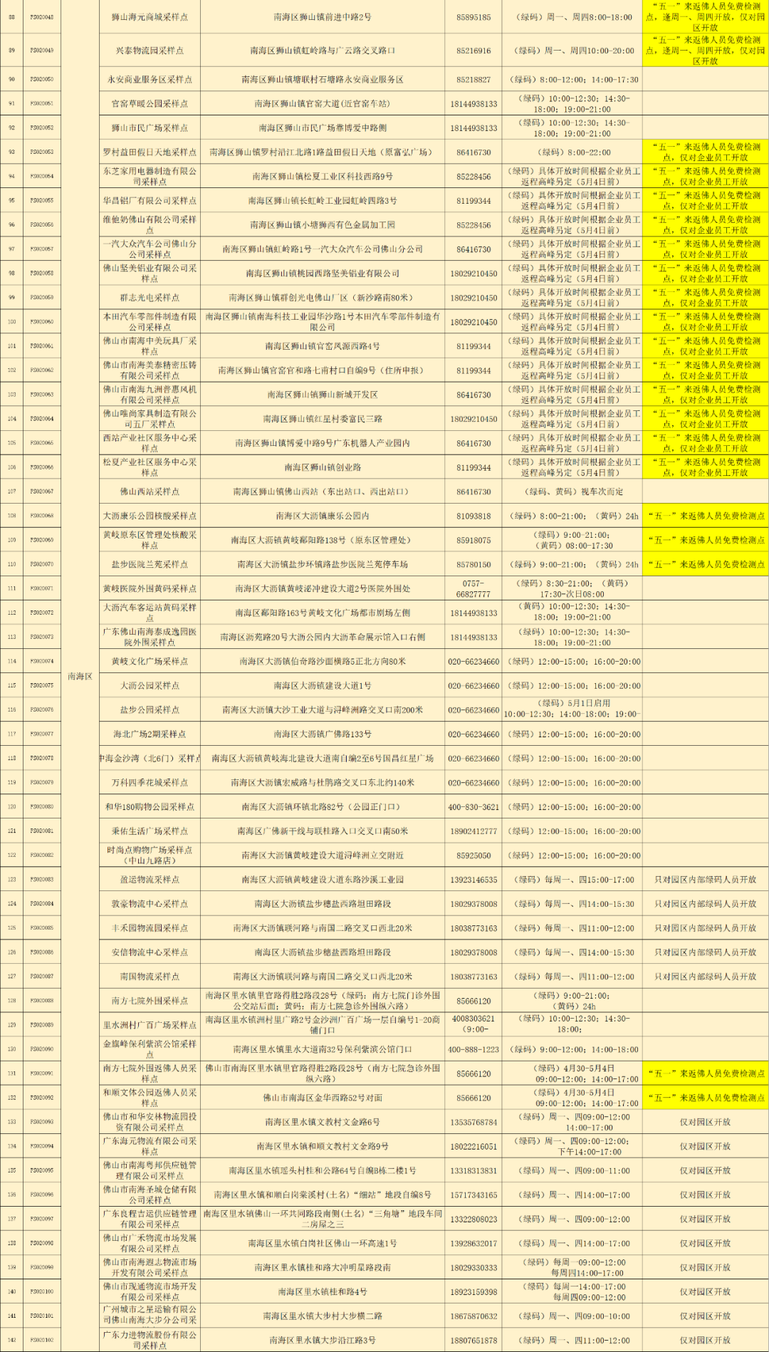 佛山便民核酸采样点公布,部分核酸采样点“五一”期间为来(返)佛人员提供免费核酸检测服务