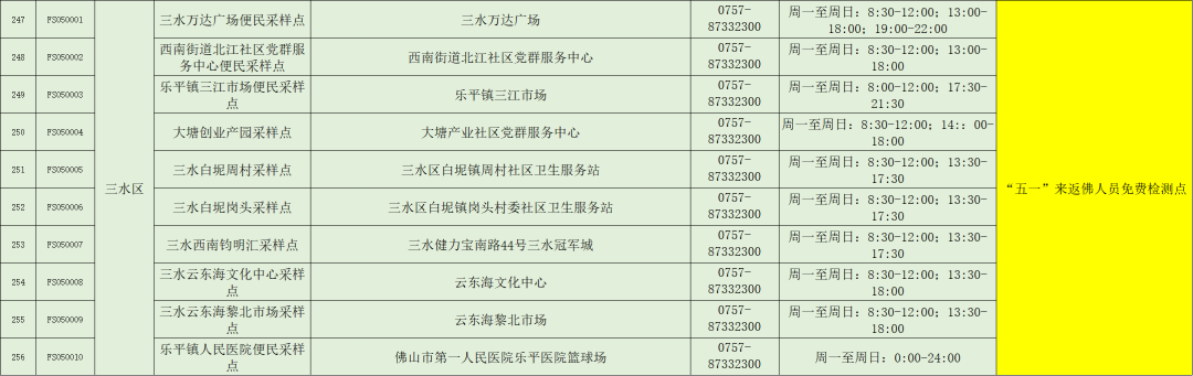 二、及时进行核酸检测。建议您从外市来(返)佛山后24小时内到就近的核酸检测点进行1次核酸检测。我市将于2022年4月30日至5月4日24时(采样点信息详见附表,后续调整以各区公布为准)为广大外市来(返)佛山的市民朋友提供一次免费核酸检测服务,您可通过“佛山通”“健康佛山”“佛山卫生健康”等公众号查询核酸采样点相关信息。