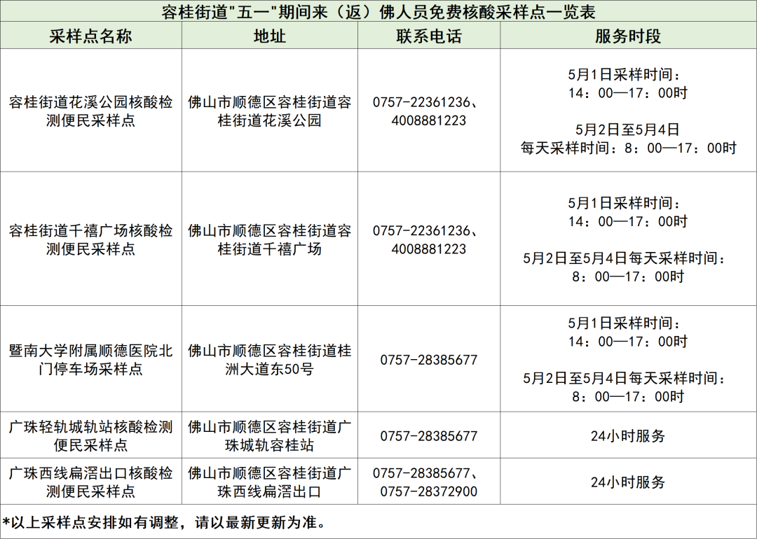 二、及时进行核酸检测。建议您从外市来(返)佛山后24小时内到就近的核酸检测点进行1次核酸检测。我市将于2022年4月30日至5月4日24时(采样点信息详见附表,后续调整以各区公布为准)为广大外市来(返)佛山的市民朋友提供一次免费核酸检测服务,您可通过“佛山通”、“健康佛山”、“佛山卫生健康”等公众号查询核酸采样点相关信息。