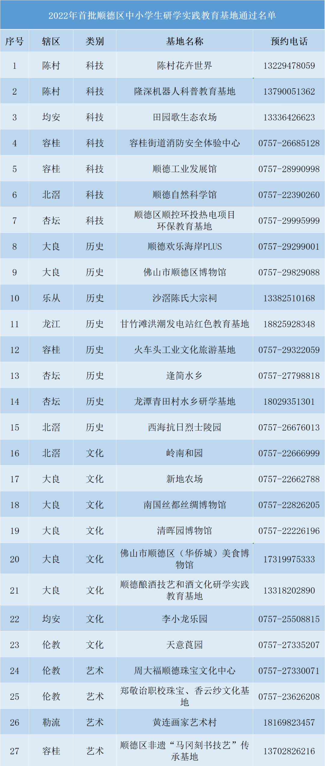 为进一步推进我区中小学生研学实践工作,顺德区教育局、区文化广电旅游体育局、区科技局等三部门面向全区开展顺德区中小学生研学实践教育基地申报、评选工作,经过材料评审、现场踏勘等程序,评定陈村花卉世界等27家单位为顺德区中小学生研学实践教育基地。