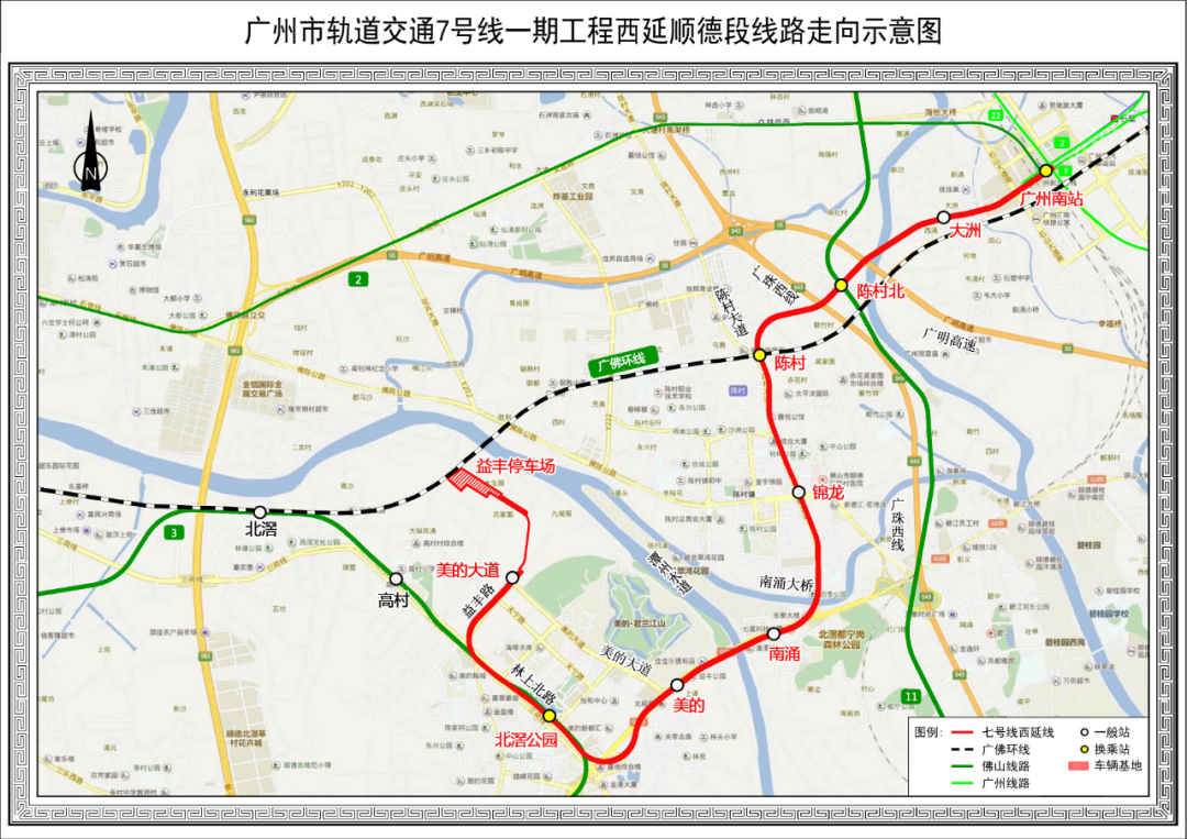 东进西延,开创广佛全域同城新征程。广州地铁7号线北起广州萝岗,南至广州南站,全程与广州轨道交通10余条线路交汇,是广州重要的东进联络线。西延顺德段起于美的大道站,无缝对接广州南站,全长约13.447千米,总投资约99.01亿元,全线地下,共设8座车站。并在北滘公园站、陈村站、陈村北站分别与佛山3号线、广佛环线、佛山11号线换乘,与7号线一期工程贯通运营,是广佛都市圈重要通道。