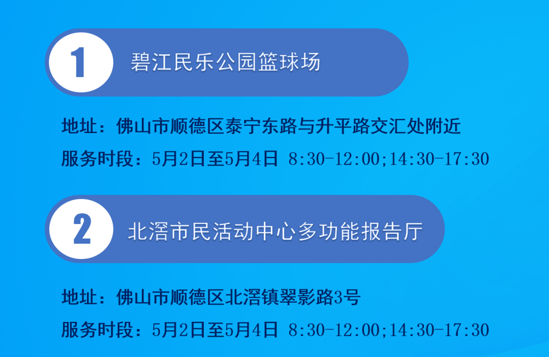 碧江民乐公园篮球场、北滘市民活动中心多功能报告厅。