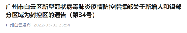 5月2日晚,广州市白云区新型冠状病毒肺炎疫情防控指挥部办公室发布第34号通告,新增人和镇部分区域为封控区。