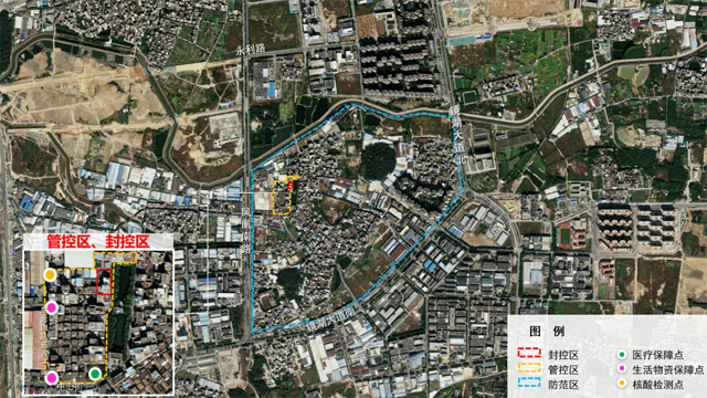 防范区:水渠以南、镜湖大道南以北、凤凰南路以东、镜湖大道北以西(封控区、管控区除外)。