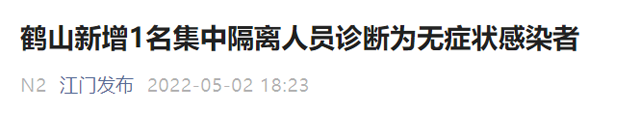 5月2日晚,江门市新型冠状病毒肺炎疫情防控指挥部办公室通报,鹤山新增1名集中隔离人员诊断为无症状感染者。