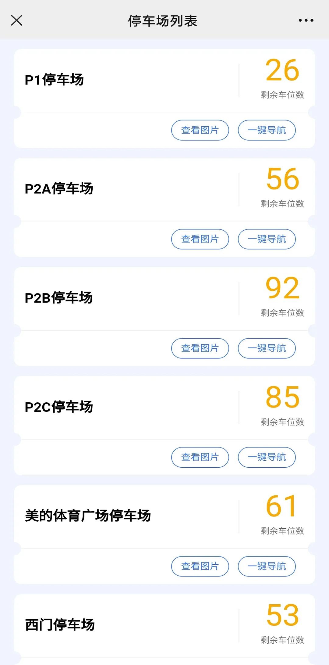 第三步:进入“停车场列表”页面,即可清楚了解园内各停车场的剩余车位数量(停车位数量信息,仅供参考,具体以实际为准)。