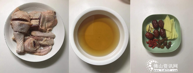 1.将配料清洗干净,红枣去核姜切片,鸡剁块备用;起锅烧水,鸡肉冷水下锅焯水。
