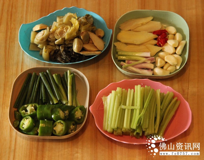 2.将配料切好,酸菜切细,芹菜和葱切断,青辣椒和干辣椒切圈圈,姜去皮切小块拍扁,蒜去皮备用。