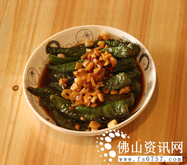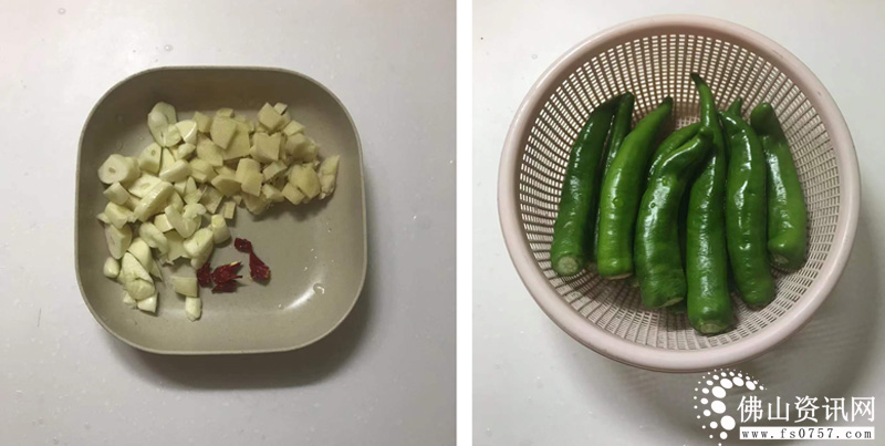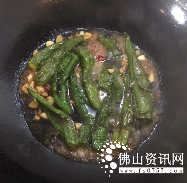 3.锅中放大量油,把青椒放入锅中炸至。尖椒变软、两面成焦斑状盛出备用。