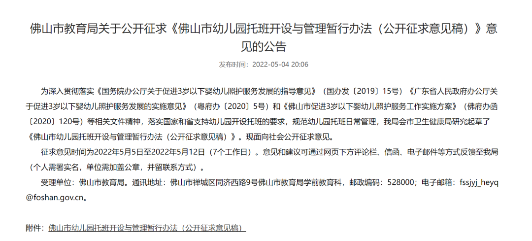 日前,佛山市教育局联合市卫生健康局发布了《佛山市幼儿园托班开设与管理暂行办法(公开征求意见稿)》,于5月5日-12日公开征求公众意见。
