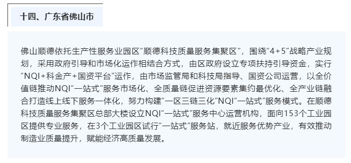 依托建设“顺德科技质量服务集聚园区”,佛山市形成了“一区三链三化” 的质量基础设施(NQI)“一站式”服务模式,实现了产业质量基础提升、技术服务能力提升、产品质量水平提升,有效推动顺德产业集群质量升级,赋能产业高质量发展。