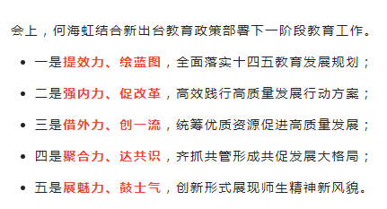 何海虹表示,禅城教育一路走来,底气十足,亮点纷呈;近来推出的系列教育政策是禅城区立足长远和当下,创新落实上级教育工作部署的具体措施。