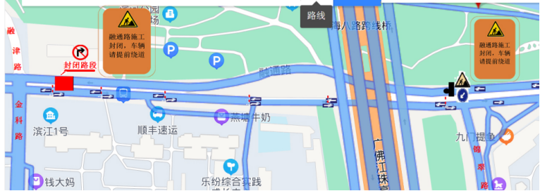 因建立桂城市政排水管网应急抢修工程库(二期)项目计划自2022年5月8日至2022年5月27日施工,临时封闭融通路(锦翠路-融津路路段)东往西车道施工作业,该路段西往东车道以道口标柱为标识改为单边双向行驶。