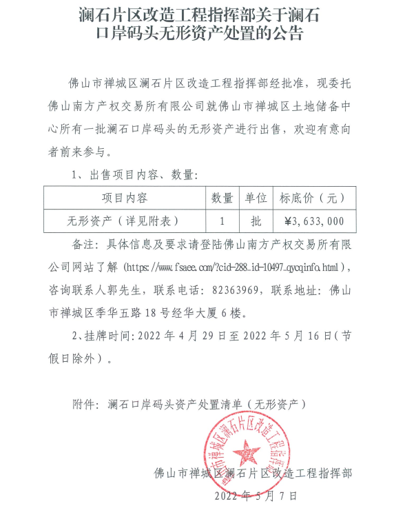 禅城区石湾镇街道关于澜石口岸码头无形资产处置的公告