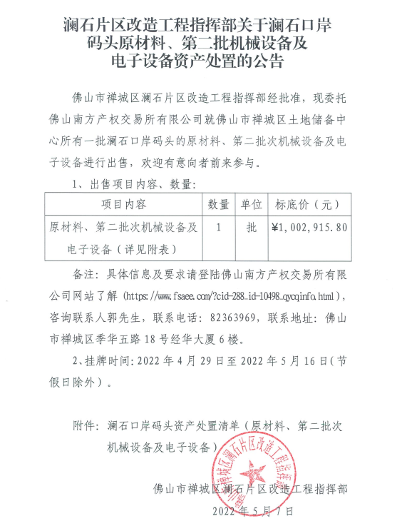 禅城区石湾镇街道关于澜石口岸码头原材料、第二批次机械设备及电子设备资产处置的公告