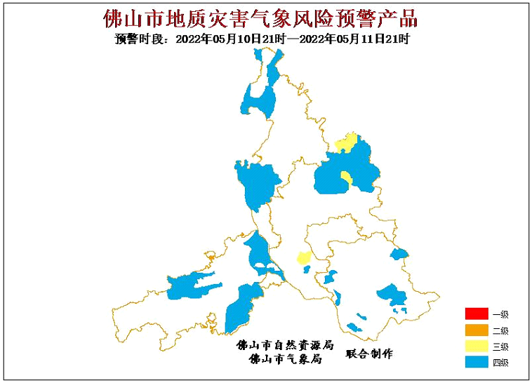 南海区的里水镇、狮山镇、大沥镇、西樵镇,顺德区的北滘镇、大良街道、均安镇、龙江镇、容桂街道、勒流街道、杏坛镇,三水区的云东海街道、南山镇、西南街道、芦苞镇、大塘镇,高明区的杨和镇、荷城街道、明城镇、更合镇等地部分区域地质灾害预警等级4级。