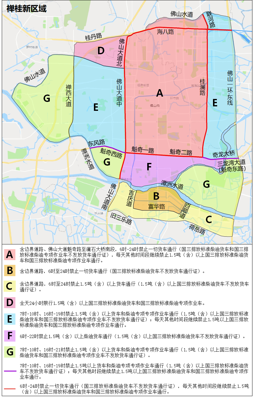 禅桂新A片区:调整。以桂澜路、联河路、佛山水道、海八路、佛山大道、魁奇路为边界(含边界路段、佛山大道魁奇路至澜石大桥南段、海八路联河大桥至S47广佛江珠高速公路段)的闭合区域内,6时-24时禁止一切货车通行(国三排放标准柴油货车不发放货车通行证),每天其他时间段继续禁止1.5吨(含)以上国三排放标准柴油货车和国三排放标准柴油专项作业车通行。