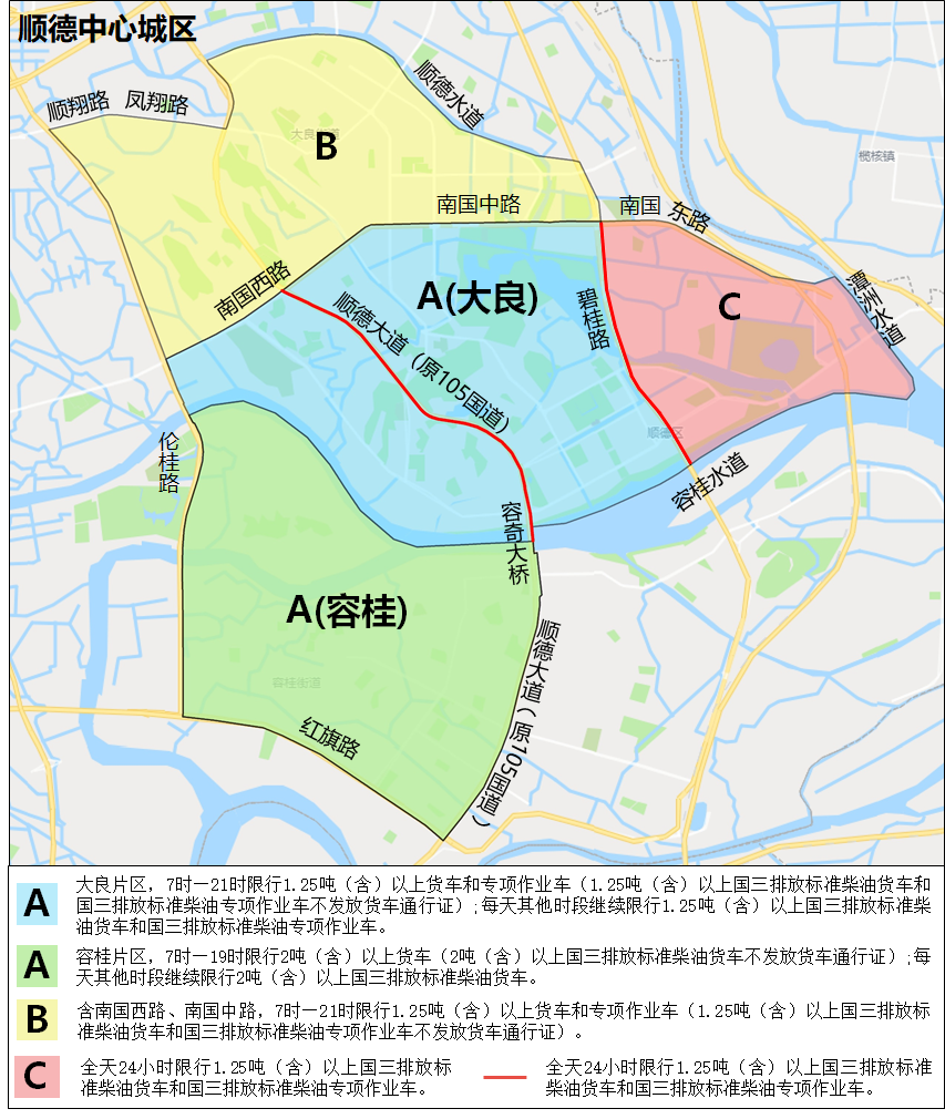 顺德A(容桂)片区:调整。以伦桂路、红旗路、顺德大道(原105国道)、容桂水道为边界的闭合区域内,7时-19时限行2吨(含)以上货车(2吨(含)以上国三排放标准柴油货车不发放货车通行证);每天其他时段继续限行2吨(含)以上国三排放标准柴油货车。