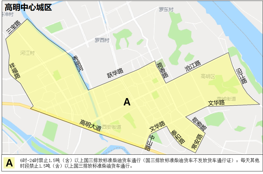 高明A片区:调整。高明区东至秀丽河、沿江路(高明大道以北至高明水厂以南路段),南至文华路、泰和路、常安路、荷香路,西至高明大道、祥福路,北至三宝路、沧江路、跃华路、荷香路(不含高明大道、祥福路、中山路)的区域,货车限行时段由“全天24小时限制通行对象为1.5吨(含)以上货车”调整为“6时至24时限制通行对象为1.5吨(含)以上货车(国三排放标准柴油货车不发放货车通行证);每天其他时段禁止1.5吨(含)以上国三排放标准柴油货车通行”。