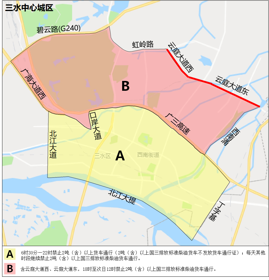 三水B片区(含云庭大道西、云庭大道东):新增。东起西南涌,西至广海大道西,南起二广高速公路,北至云庭大道东、云庭大道西、虹岭路、碧云路(G240)区域(不含北江大道、广海大道西、虹岭路、碧云路(G240),含云庭大道西、云庭大道东),18时至次日12时禁止2吨(含)以上国三排放标准柴油货车通行。