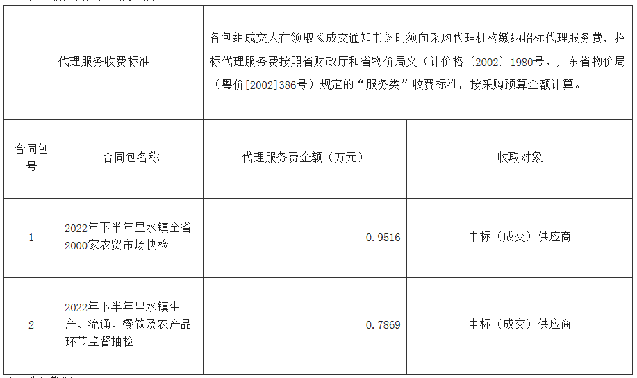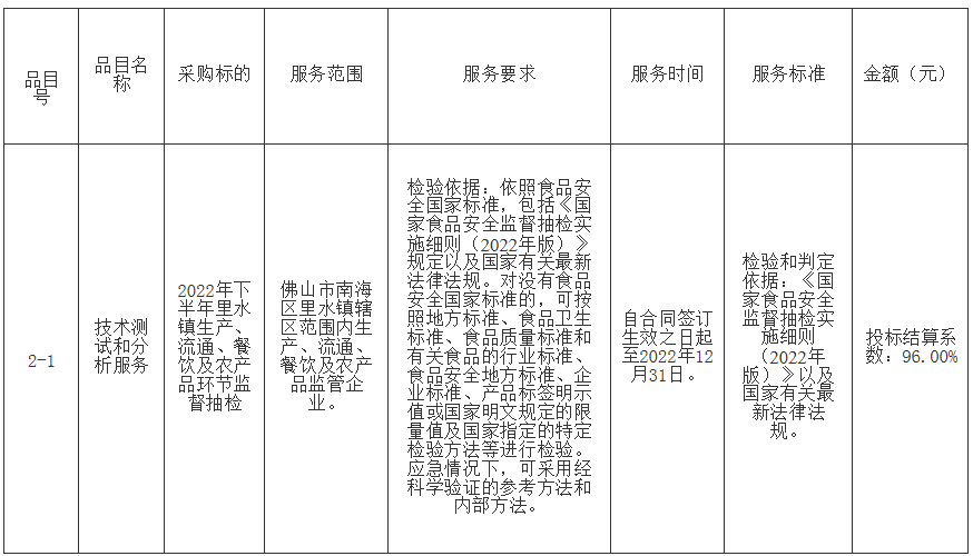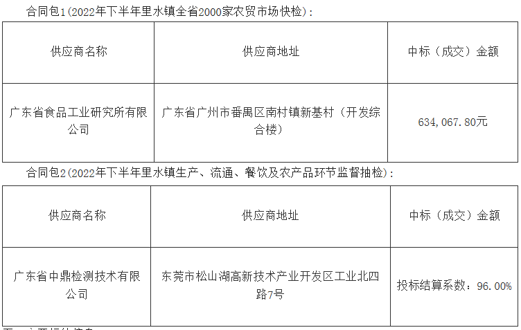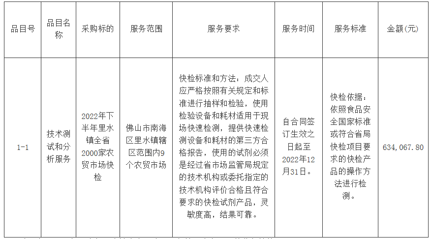 南海区里水镇2022年下半年食品及农产品监督抽检、快检抽检服务采购结果公告