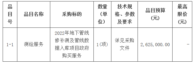 2022年地下管线修补测及管线数据入库项目政府购买服务采购项目的潜在供应商应在广东省政府采购网https://gdgpo.czt.gd.gov.cn/获取采购文件,并于 2022年05月24日 09时30分 (北京时间)前提交响应文件。