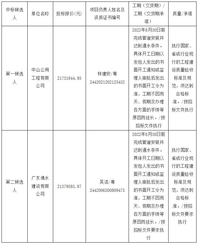 杏坛二环路(逢简路口至杏龙路)DN1000给水管道工程项目招标的评标工作已经结束,经组织专家评审,评标委员会推荐了中标候选人。现将该项目中标候选人投标文件(涉及商业秘密除外)进行公示,公示期为2022年05月12日0时至2022年05月15日0时。