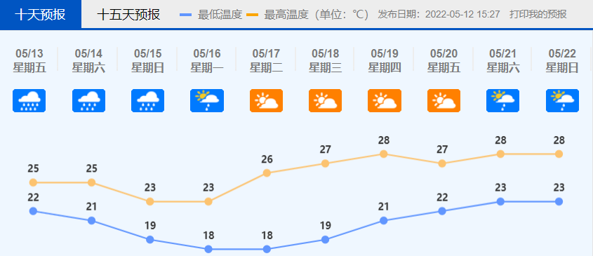 15日:阴天,有大雨,19~22℃;