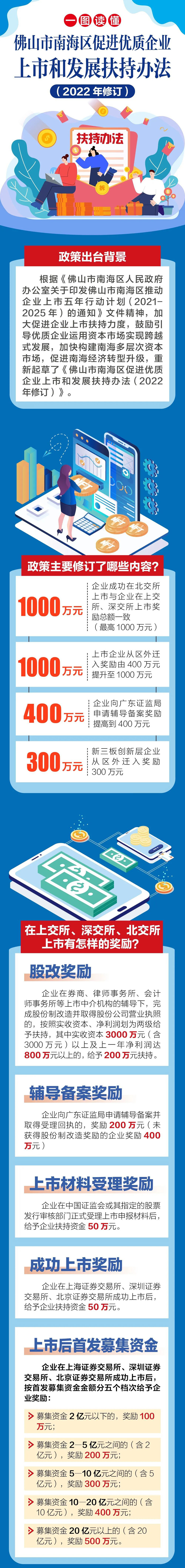 为加大促进企业上市扶持力度,南海区重新修订了《佛山市南海区促进优质企业上市和发展扶持办法(2022年修订)》(以下简称“《扶持办法》”),助力企业发展。