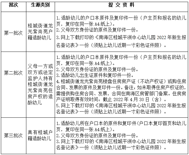 第一批次:具有户籍登记地址为桂城街道龙光紫尚苑的适龄幼儿【以户口本为准,截止到2022年4月30日(含)】。