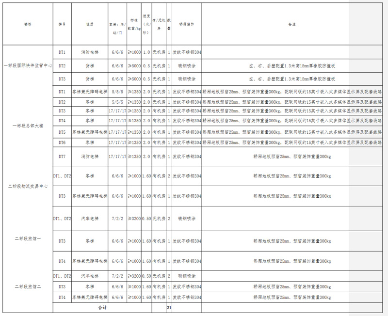 2.2 项目建设规模:佛山国际陆港(国家物流枢纽首期)项目电梯采购及安装工程包括21台电梯成套产品的深化设计、生产、供货、前期土建跟踪、安装、调试、验收(报装、报验)及领取电梯检验合格证、两年质保期的电梯免费维保及年审、培训及其它相关服务等,具体数量以报价清单为准: