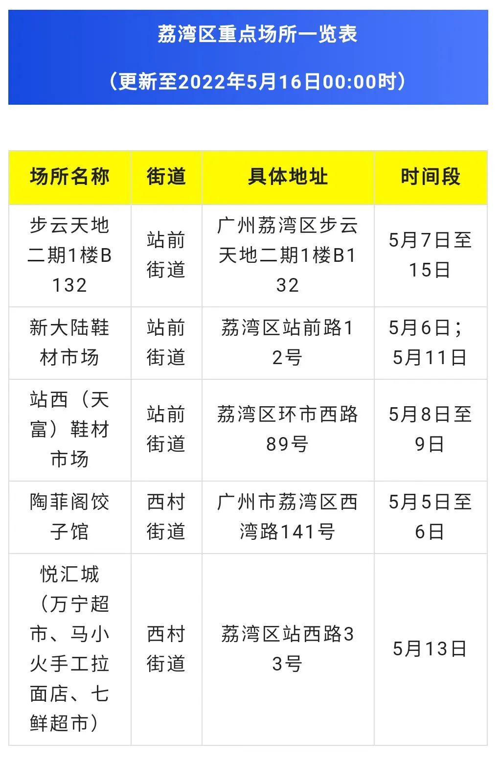 因疫情防控需要,请在相关时段到过站前街和西村街重点场所的人员,立即向所在社区联系报备,并前往就近的核酸检测点进行核酸检测,同时按照社区和疾控部门要求配合做好健康管理。重点场所名单后续将按实际情况更新。